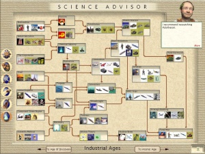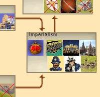 Dieses zivilisationsspezifische Gebäude stellt nun die Voraussetzung für die Errichtung weiterer zivilisationsspezifischer Gebäude dar, wobei mit dieser Methode unterschiedliche Gebäude für verschiedene Zivilisationen in der gleichen Technologiebox des Technologiebaums wiedergegeben werden können. Der Screenshot zeigt die Technologie "Imperialismus", bei der die Deutschen mit Erforschung selbiger das Brandenburger Tor bauen können, die Russen den Kreml und die Engländer den Buckingham Palast.